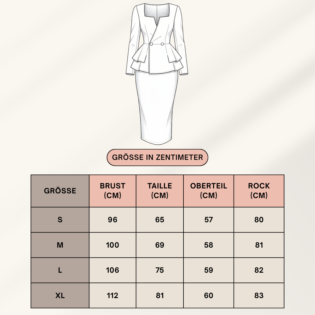 Dieses zweiteilige Damen-Set kombiniert einen langärmeligen Blazer im modernen Square-Neck (Karree-Ausschnitt) mit einem passenden langen Rock. Die Knöpfe und Taschen machen den Look zugleich stilvoll und praktisch – perfekt für einen cleanen, eleganten Auftritt in Herbst und Winter.